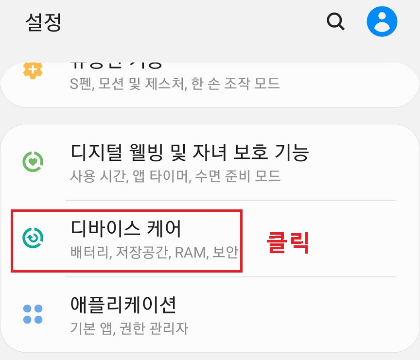 2. 설정페이지에서 디바이스 케어를 클릭한다.