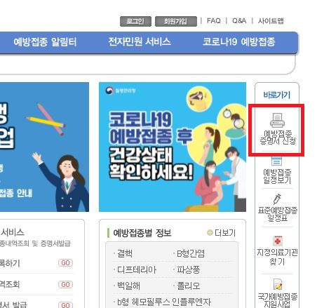 1. 질병관리청 예방접종 도우미 사이트에 접속해서 오른쪽 예방접종 증명서 신청을 한다.