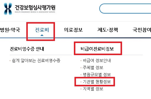 2. 건강보험심사평가원 홈페이지에 접속해서 진료비 → 비급여 진료비 정보 → 기관별 현황 정보 순으로 클릭한다.