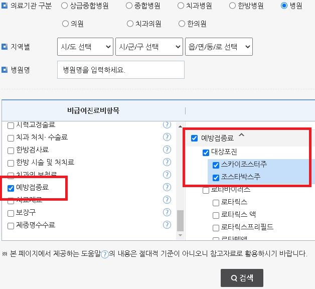 5. 이제 의료기관 구분을 체크하고 지역을 선택하고 아래쪽 검색을 클릭한다.