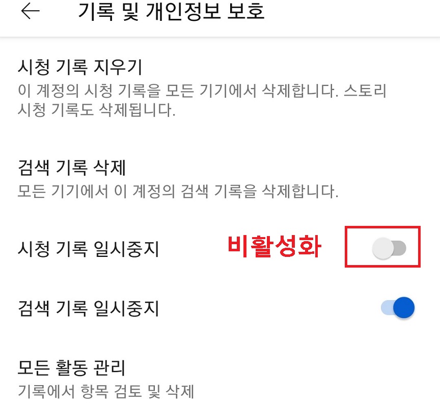 4. 시청기록 일시중지 버튼을 좌측으로 옮겨 비활성화시킨다.