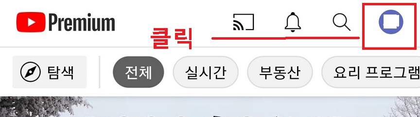 1. 모바일 유튜브 화면 우측 상단에서 아이디를 클릭한다.