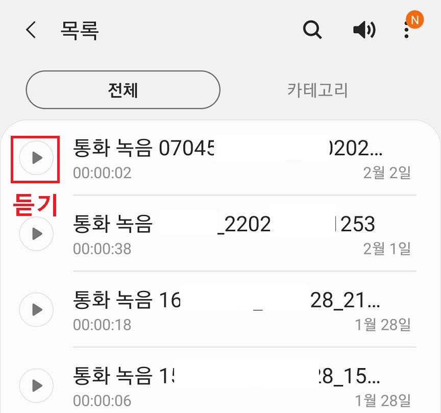 3. 그럼 음성녹음앱에 있는 통화 녹음 파일 + 일반 녹음 파일이 전체 목록이 나타난다.