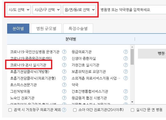 2. 상단의 시도, 시군구, 읍면동을 선택 후 아래쪽 좌측의 코로나 19 검사 실시기관을 클릭 후 검색한다.