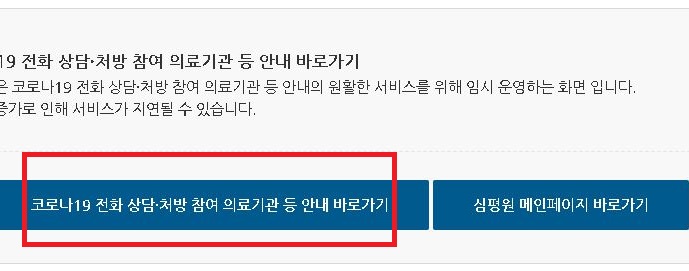 2. 그럼 도입부에 두 개의 메뉴를 선택할 수 있는데 여기서 좌측 코로나 19 전화상담 처방 참여 의료기관 등 안내 바로가기를 클릭한다.