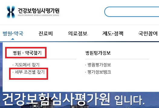 1. 이번에는 건강보험심사평가원 홈페이지 메인에서 병원 약국 → 세부 조건별 찾기를 클릭한다.