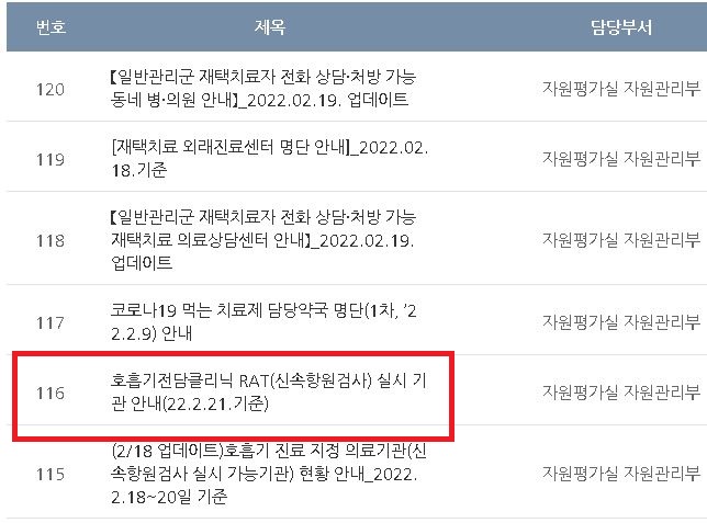 3. 게시판이 바로 보이는데 이중 호흡기 전담 클리닉 RAT(신속항원 감사) 실시기관 안내를 클릭한다.