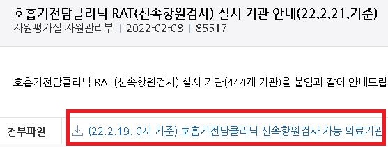 4. 내용 아래쪽 첨부파일 호흡기 전담 클리닉 신속항원검사 가능 의료기관을 클릭하여 다운로드한다.