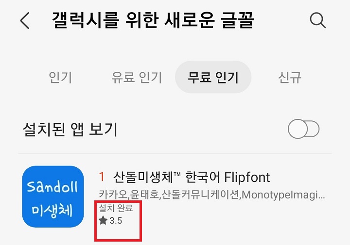 8. 해당 갤럭시 글씨체가 설치 완료되면 완료 표시가 뜬다.