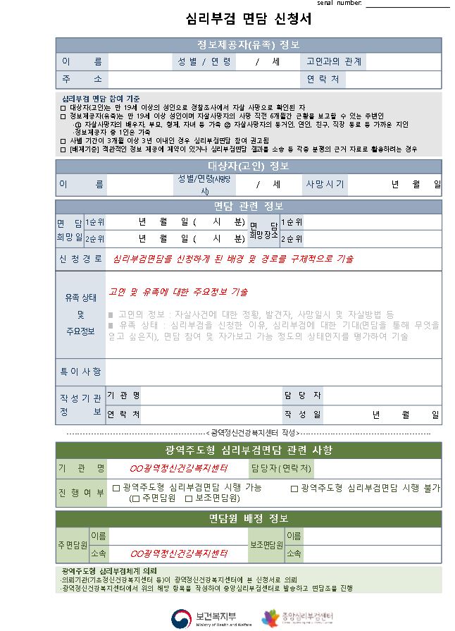 중앙심리부검센터 및 각 지역 정신건강복지센터에 문의하면 된다.