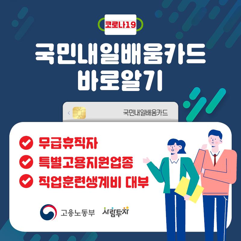 국민 내일 배움 카드는 고용노동부에서 지원하는 제도로서 취업여부나 직종에 상관없이 직업훈련을 받을수 있도록 교육비용을 지원하는 제도이다.