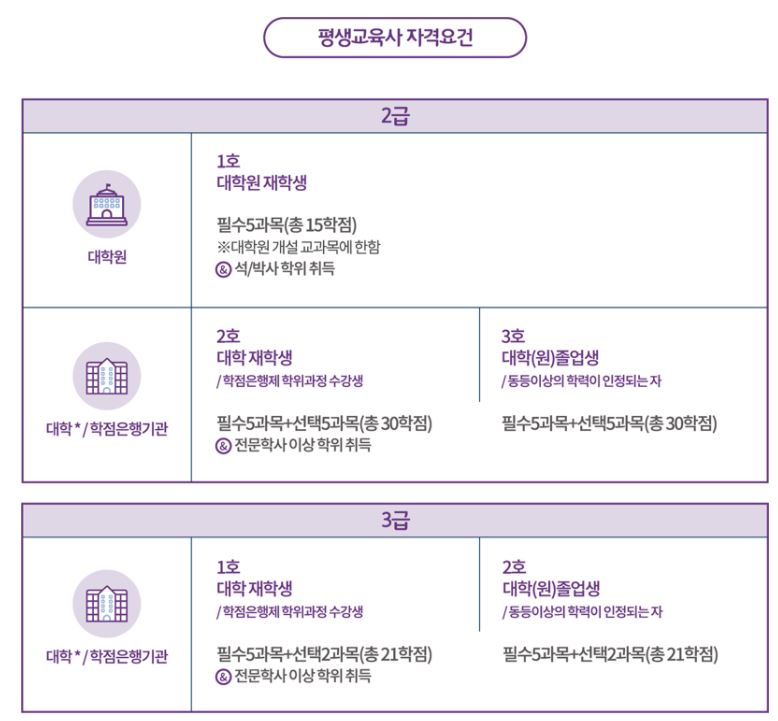 2급과 3급은 대학이나 학점은행기관에서 정해진 학점을 이수해야 한다.